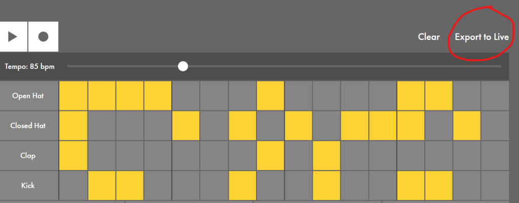 The way we were told to try and experiment with Abletone was to first create a beat on Play With Beats Abletone website. I had a beat of fun (haha punny…) experimenting and then settled for one sound which I Exported to Abletone Live. The whole process was super easy because all I did was click this button: