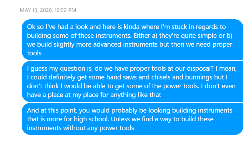 Both of us also decided that it would be wise to have a conversation with James, our lecturer, about the direction of this project. There were definitely a few points which we weren’t sure about such as, for example, whether to make the instrument designs aimed at primary or high school students. Likewise, we weren’t sure on the amount of work we were required to present as a two-person group so yes, James’ help was definitely needed!