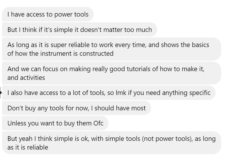 So, to summarise, Lucy and I will try to build instruments that are complex enough in design but simple enough for students. Also no power tools. Easy, right? π